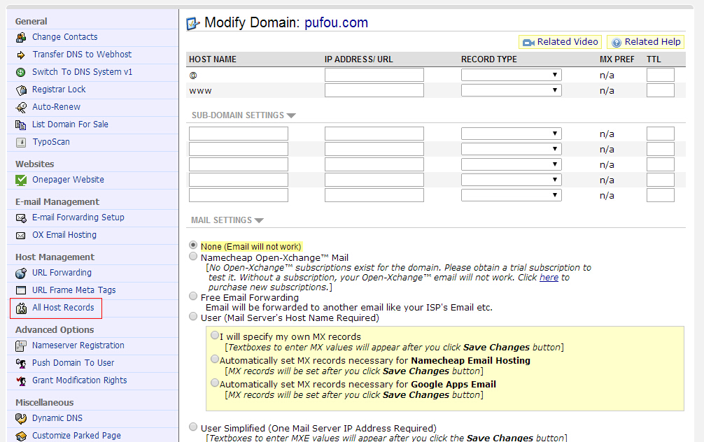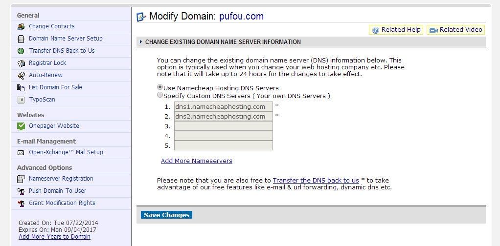 在這一步卡了很久,在百思不得其解的情況下,無奈使用Namecheap的Live Chat功能聯(lián)系了在線客服,總結(jié)出一旦你把域名轉(zhuǎn)入Namecheap,就無法使用FreeDNS了。FreeDNS的服務(wù)對(duì)象是托管在其他域名商的域名,例如,你的域名托管在Godaddy,那么你可以用FreeDNS來解析它。