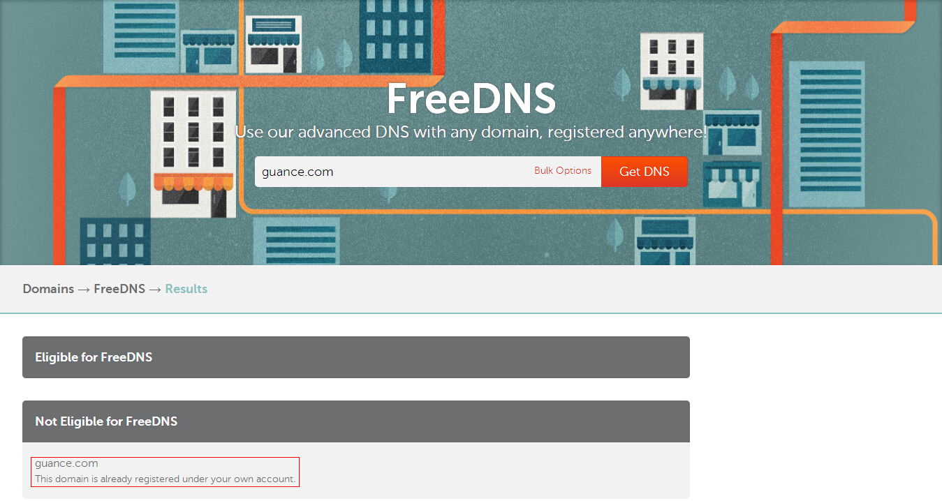 既然找不到域名,是不是得先添加?當(dāng)我們?cè)谶@個(gè)界面輸入域名,點(diǎn)擊“Get DNS”時(shí),卻被告知:xxx.com This domain is already registered under your own account.