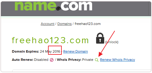 9、Name.com域名續(xù)費一年成功,含一年的Whois保護服務(wù)。