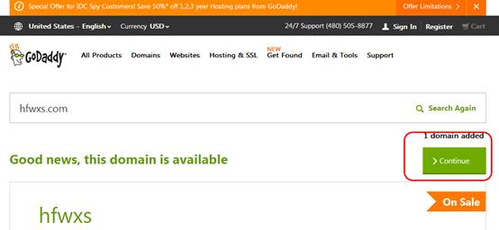 二、如果您輸入的域名已經(jīng)被注冊的話,會提示Sorry, xxxx is already taken,你就需要換個域名了。如果您輸入的域名可用的話,會提示Good news,this domain is available,點擊右側(cè)的Continue(下面的內(nèi)容不用看),在godaddy域名注冊的時候填寫的域名一般是頂級域名,就是不帶www的域名。