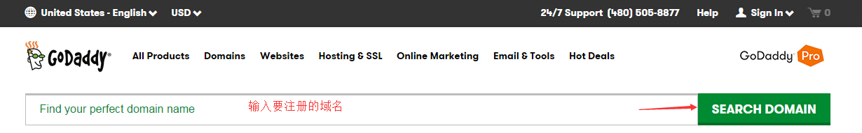 一、進入Godaddy官方網(wǎng)站,在域名注冊頁面的搜索框中輸入要注冊的域名,或者點擊導(dǎo)航上的“Domain”→“Domain Search”搜索域名,然后點擊后面的Search Domain。