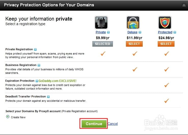 2、如下圖所示,彈出提示框,這個界面是一個廣告界面,介紹Godaddy的幾種域名隱私保護服務(wù)的。我們直接點擊”Continue”按鈕繼續(xù)。