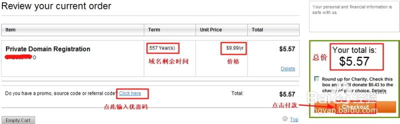 3、如圖,進(jìn)入購物車之后,可以看到當(dāng)前購買的whois隱私保護的價格。這個價格是根據(jù)你的域名還有多久到期來換算的,也就是一年是9.99美元,然后攤到每天多少錢,再根據(jù)你域名到期剩余時間計算。