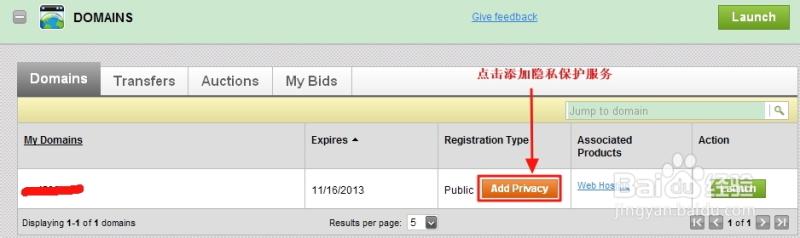 1、域名已經(jīng)注冊的情況下,我們?nèi)绻獮橛蛎徺I隱私保護服務(wù)的話,就需要登錄帳號,然后點擊”Domains”展開域名列表,然后如下圖所示,我們可以看到在域名的”Registration Type”欄中有個”Add Privacy”按鈕。點擊該按鈕。