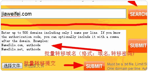 3、Namesilo支持批量域名轉(zhuǎn)入,如果你有多個域名的話,可以提交文件列表。