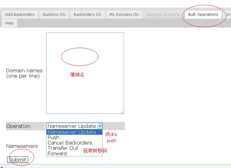 2:點(diǎn)擊 Bulk Operations可以批量操作域名,在框里面輸入域名,一行一個(gè),選擇需要的選項(xiàng)操作,然后點(diǎn)擊Submit。