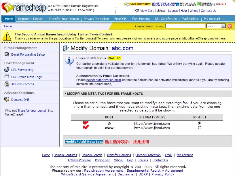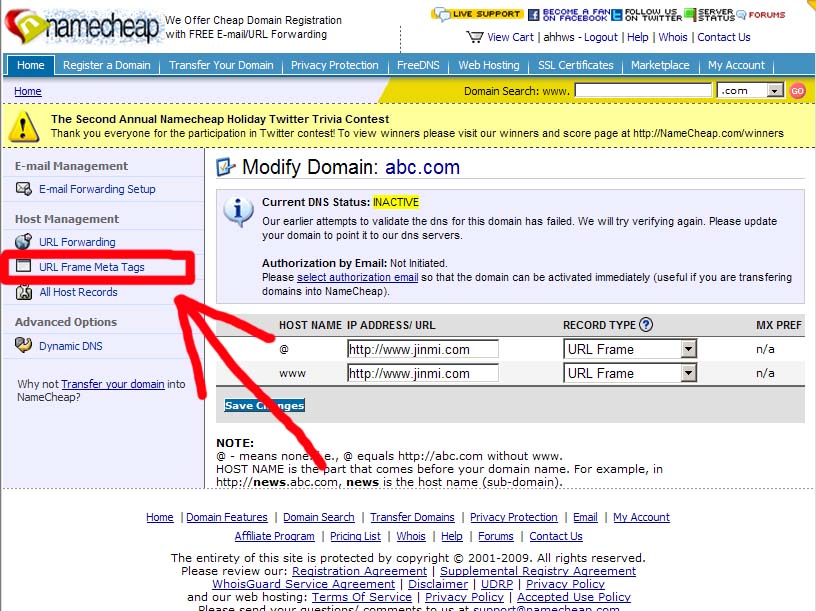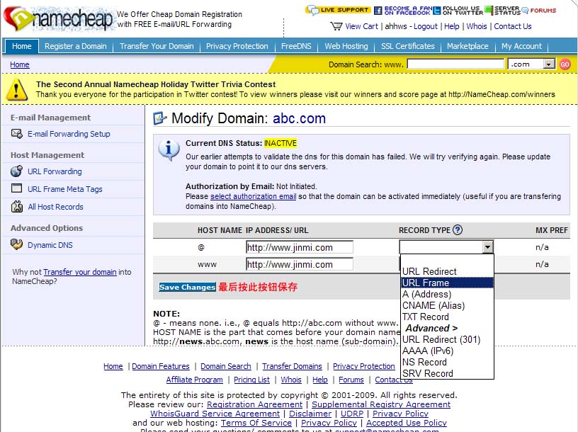 步驟9:在此進行轉發(fā),將下圖中所示的“www.jinmi.com”改成你的目標網址(不改行不行?行!反正我沒意見),右邊下拉框是解析類型,“URL Redirect”是顯性轉發(fā),“URL Frame”是隱性轉發(fā),如果你不知道兩者的區(qū)別,建議都試一下,實踐是檢驗真理的唯一標準嘛。還有別的選項你不知道是什么意思?那我也不知道(我不費口舌了),反正與轉發(fā)無關。