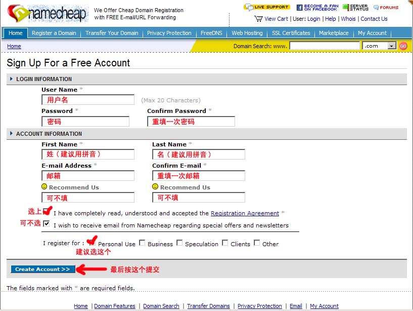 步驟1:打開www.namecheap.com,按圖中箭頭所指,首先注冊一個帳戶。