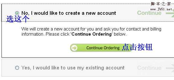 然后,選中“NO,I would like to creat a new account”前面的單選框。點(diǎn)擊“Contine Ordering”按鈕。
