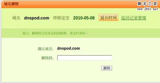 設(shè)定好時(shí)間,點(diǎn)擊鎖定按鈕,域名立刻鎖定,解鎖碼發(fā)送到您在DNSPod的注冊(cè)郵箱,請(qǐng)保證您郵箱可以正常收到DNSPod發(fā)出的郵件。