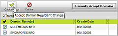 然后你會(huì)在這個(gè)過(guò)戶域名列表中看到我們過(guò)戶給你的域名。在勾選框選擇你需要接收的域名,然后在頂部 工具欄中點(diǎn)擊接收(Accept)按鈕,域名便會(huì)開始過(guò)戶到你賬戶中。