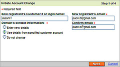 你還可以自定義過(guò)戶買家信息填寫點(diǎn)擊中間的 "Use details from specified customer account" 。然后選擇下一步 "next" 按鈕。 (跟多信息請(qǐng)查看: "Godaddy官方轉(zhuǎn)移介紹 [英文]" 第5到第11部分)
