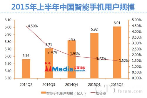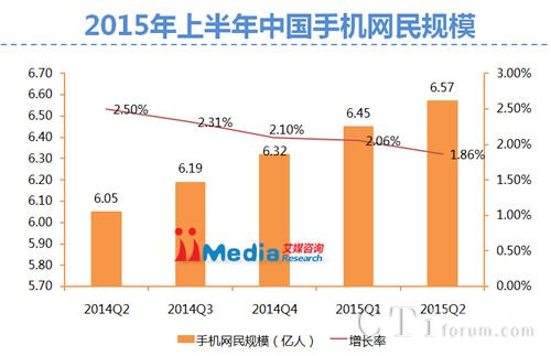 iiMedia Research(艾媒咨詢)數(shù)據(jù)顯示,截止2015年第二季度,中國(guó)手機(jī)網(wǎng)民規(guī)模達(dá)到6.57億,環(huán)比增長(zhǎng)1.86%。