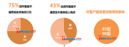 iiMedia Research(艾媒咨詢)數(shù)據(jù)顯示,75%的顧客因?qū)头粷M而放棄購(gòu)買行為;超過四成的顧客因?qū)头粷M而不推薦他人購(gòu)買。其中,85后、90后等新一代用戶群體,對(duì)客戶服務(wù)更加敏感。
