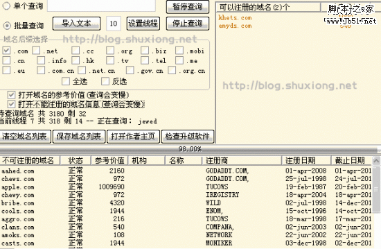 目前已經(jīng)完成前面三項,正在查詢第四項,*結(jié)果發(fā)現(xiàn)前面三項全部被注冊,第四項已經(jīng)查詢完1/3,只有khets.com和emyds.com沒被注冊