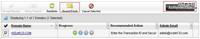 如果你沒有收到godady的確認轉(zhuǎn)移域名的Emai,可以點擊“resend email ”圖標,再次發(fā)送確認郵件。