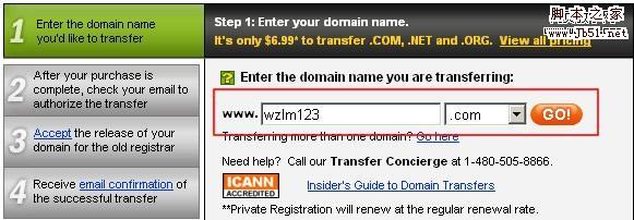 3、輸入需要轉(zhuǎn)移的域名。比如我要轉(zhuǎn)移的域名是 www.wzlm123.com,然后點擊GO!