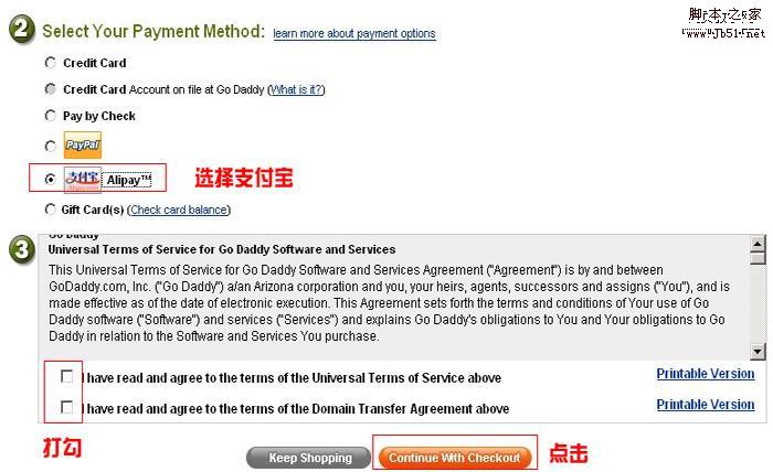 6、選擇付款方式。轉(zhuǎn)域名到godaddy 需要支付一年的域名服務(wù)費:$7.19。現(xiàn)在開始GD已經(jīng)支持支付寶付款,建議選擇支付寶或者Paypal付款,這兩種方式相對安全,我選擇是支付寶付款。非常方便,安全有保證。(注意:在付款之前,確保您的域名是解鎖狀態(tài)并且已經(jīng)拿到原注冊商轉(zhuǎn)移碼,請查看文章底部附加說明)