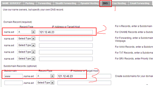 然后我們就看到一排的解析選項(xiàng),直接步入正題,點(diǎn)擊上面的DNS按鈕,然后我們看到解析的A記錄,按照?qǐng)D示,在2位置選擇A記錄或者別名,輸入我們的IP或者別名解析。然后在子域名位置,輸入我們的WWW或者其他二級(jí)域名,然后后面依舊選擇對(duì)應(yīng)的記錄名稱(chēng),后面輸入IP。