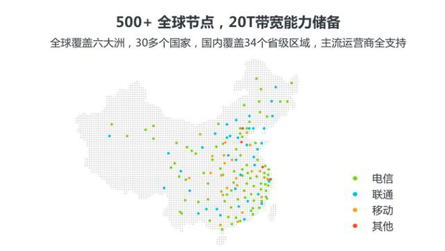 和阿里云一樣,騰訊云加速節(jié)點(diǎn)也覆蓋全球 30 多個(gè)國(guó)家和地區(qū),但600+的加速節(jié)點(diǎn)比阿里云多,而且總帶寬40T是阿里云的兩倍。