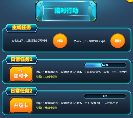 日常任務(wù)2:通過邀請鏈接成功邀請1人新購“五折或者七折”云計算產(chǎn)品,獎勵升級卡1張,該升級卡可將領(lǐng)取的1元30天vps服務(wù)器升級為更高配置。
