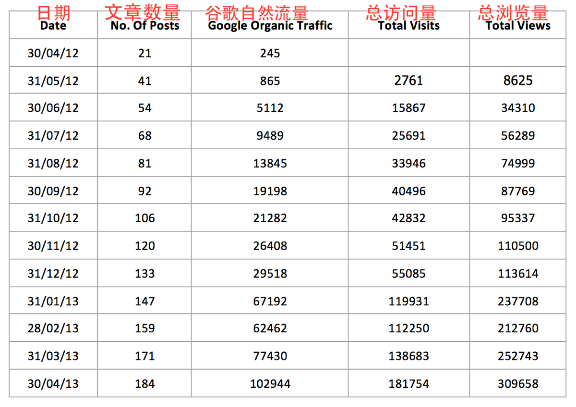 2012年4月成立,到2013年4月底,來自谷歌的月度流量是10.3萬人次。下面是12個月的數(shù)據(jù)。