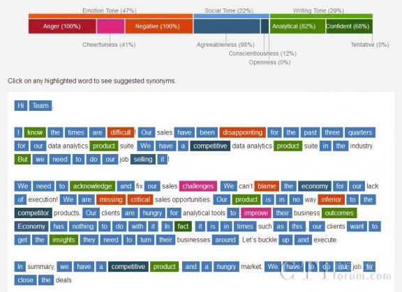 該工具可協(xié)助使用者處理大量文字或文章,或是幫助使用者校稿,也能用來分析別人的訊息以作適當(dāng)?shù)幕貞?yīng)。此一工具目前僅支援英文訊息,可供免費試用。IBM也已經(jīng)釋出相關(guān)的API供開發(fā)人員打造可嵌入電子郵件或社交媒體的外掛程式。