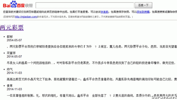 前幾日,我的客戶電話說(shuō)自己的百度排名沒(méi)有了,查詢下竟然百度標(biāo)簽顯示的內(nèi)容是一家彩票平臺(tái)的網(wǎng)站內(nèi)容。 我知道網(wǎng)站被黑客加入了非法代碼,惡意篡改了百度快照。(截圖如下)