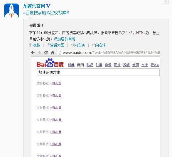 巨人網(wǎng)絡(luò)通訊聲明:本文標(biāo)題《百度搜索出現(xiàn)故障(文件格式 html版) 加速樂提醒網(wǎng)站加強(qiáng)運(yùn)維》,本文關(guān)鍵詞 百度,搜索,出現(xiàn),故障,文件,;如發(fā)現(xiàn)本文內(nèi)容存在版權(quán)問題,煩請?zhí)峁┫嚓P(guān)信息告之我們,我們將及時溝通與處理。本站內(nèi)容系統(tǒng)采集于網(wǎng)絡(luò),涉及言論、版權(quán)與本站無關(guān)。