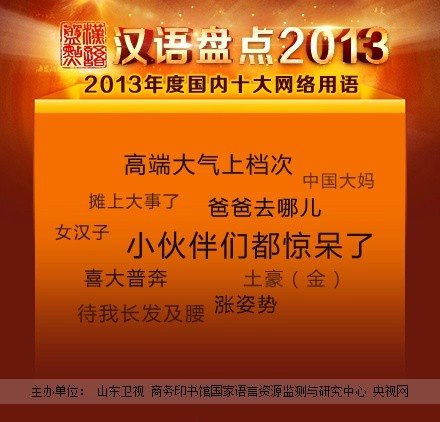 除了年度字、詞,2013年“十大網(wǎng)絡(luò)用語(yǔ)”同時(shí)對(duì)外發(fā)布,這些鮮活的語(yǔ)言是中國(guó)人網(wǎng)絡(luò)生活的生動(dòng)寫(xiě)照。“十大網(wǎng)絡(luò)用語(yǔ)”由國(guó)家語(yǔ)言資源監(jiān)測(cè)與研究網(wǎng)絡(luò)媒體中心依據(jù)規(guī)模動(dòng)態(tài)流通語(yǔ)料庫(kù),利用語(yǔ)言信息處理技術(shù),在監(jiān)測(cè)語(yǔ)料數(shù)據(jù)的基礎(chǔ)上對(duì)今年出現(xiàn)的流行詞語(yǔ)、新詞語(yǔ)、網(wǎng)絡(luò)用語(yǔ)展開(kāi)分析、綜合、提取而成。