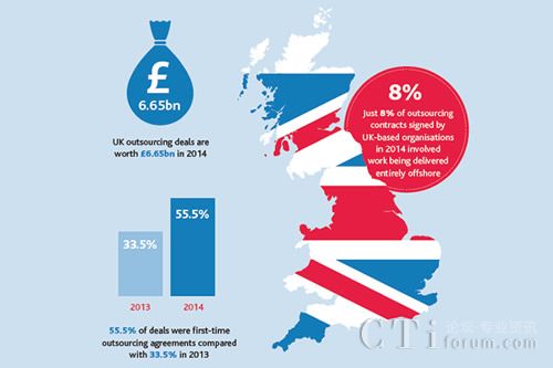 歐唯特編制的其英國(guó)外包指數(shù)顯示了2014年相關(guān)的客戶服務(wù)統(tǒng)計(jì)數(shù)據(jù)。值得注意的是,報(bào)告顯示去年外包合同中只有8%的是離岸外包。與2013年的10%相比,這是一個(gè)顯著的下降,它影響數(shù)十億英鎊的外包交易額----98億美金。