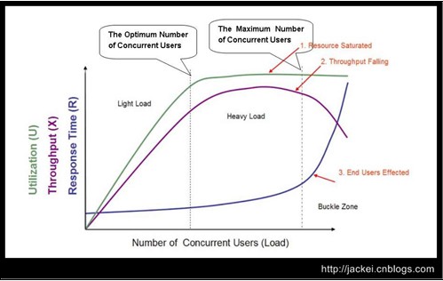 并發(fā)用戶數(shù)和QPS兩個概念沒有直接關(guān)系,但是如果要說QPS時,一定需要指明是多少并發(fā)用戶數(shù)下的QPS,否則豪無意義,因為單用戶數(shù)的40QPS和20并發(fā)用戶數(shù)下的40QPS是兩個不同的概念。前者說明該應(yīng)用可以在一秒內(nèi)串行執(zhí)行40個請求,而后者說明在并發(fā)20個請求的情況下,一秒內(nèi)該應(yīng)用能處理40個請求,當(dāng)QPS相同時,越大的并發(fā)用戶數(shù),代表了網(wǎng)站并發(fā)處理能力越好。對于當(dāng)前的web服務(wù)器,其處理單個用戶的請求肯定戳戳有余,這個時候會存在資源浪費的情況(一方面該服務(wù)器可能有多個cpu,但是只處理單個進程,另一方面,在處理一個進程中,有些階段可能是IO階段,這個時候會造成CPU等待,但是有沒有其他請求進程可以被處理)。而當(dāng)并發(fā)數(shù)設(shè)置的過大時,每秒鐘都會有很多請求需要處理,會造成進程(線程)頻繁切換,反正真正用于處理請求的時間變少,每秒能夠處理的請求數(shù)反而變少,同時用戶的請求等待時間也會變大,甚至超過用戶的心理底線。所以在最小并發(fā)數(shù)和最大并發(fā)數(shù)之間,一定有一個最合適的并發(fā)數(shù)值,在并發(fā)數(shù)下,QPS能夠達到最大。但是,這個并發(fā)并非是一個最佳的并發(fā),因為當(dāng)QPS到達最大時的并發(fā),可能已經(jīng)造成用戶的等待時間變得超過了其最優(yōu)值,所以對于一個系統(tǒng),其最佳的并發(fā)數(shù),一定需要結(jié)合QPS,用戶的等待時間來綜合確定。圖1 并發(fā)用戶數(shù),QPS,用戶平均等待時間(響應(yīng)時間關(guān)系圖) 上面這張圖是應(yīng)用其他人的關(guān)于并發(fā)用戶數(shù),QPS,用戶平均等待時間的一張關(guān)系圖,對于實際的系統(tǒng),也應(yīng)該是對于不同的并發(fā)數(shù),進行多次測試,獲取到這些數(shù)值后,畫出這樣一張圖出來,以便于分析出系統(tǒng)的最佳并發(fā)用戶數(shù)。