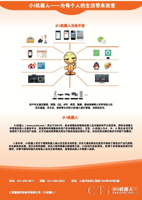 巨人網(wǎng)絡(luò)通訊聲明:本文標(biāo)題《2015中國呼叫中心及企業(yè)通信大會參展廠商:小i機器人》,本文關(guān)鍵詞 2015,中國,呼叫中心,及,企業(yè),;如發(fā)現(xiàn)本文內(nèi)容存在版權(quán)問題,煩請?zhí)峁┫嚓P(guān)信息告之我們,我們將及時溝通與處理。本站內(nèi)容系統(tǒng)采集于網(wǎng)絡(luò),涉及言論、版權(quán)與本站無關(guān)。