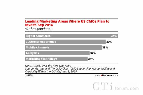 但是,當(dāng)問(wèn)及明年計(jì)劃投資的營(yíng)銷領(lǐng)域時(shí),數(shù)據(jù)分析卻排在倒數(shù)第二位,有32%的CMOs選擇,落后于數(shù)字商務(wù)、消費(fèi)者體驗(yàn)和移動(dòng)。和數(shù)據(jù)分析緊密相連的營(yíng)銷技術(shù)排在倒數(shù)第一(31%)。