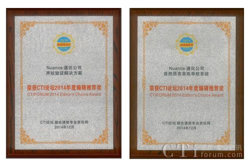 Nuance 通訊公司宣布,由CTI論壇主辦的2014年度CTI論壇“編輯推薦獎”評選結果揭曉,Nuance憑借其領先的語音技術再次斬獲殊榮,聲紋驗證解決方案和自然語言來電導航系統(tǒng)均獲得2014年度 “編輯推薦獎”。