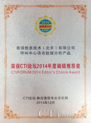 2014年12月22日,在CTI論壇于北京3W互聯(lián)網(wǎng)主題咖啡館舉行的 “2014CTI論壇編輯推薦獎” 行業(yè)主題沙龍暨頒獎儀式上,普強信息憑借“千尋”360度語音分析系統(tǒng)榮獲產(chǎn)品技術類--呼叫中心語音數(shù)據(jù)分析產(chǎn)品。cTO李全忠先生在業(yè)內(nèi)資深人士自由發(fā)言環(huán)節(jié)就“聯(lián)絡中心管理方式及軟件的趨勢”和“大數(shù)據(jù)時代 呼叫中心能做什么”發(fā)表精彩言論。