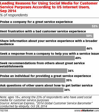 根據(jù)American Express的研究,23%的美國網(wǎng)民出于客戶服務目的使用社交媒體。但是,這么做的原因并不是向企業(yè)尋求幫助。大部分將社交媒體作為客戶服務的網(wǎng)民是為了稱贊企業(yè)的良好的消費體驗,半數(shù)的網(wǎng)民這么做是為了投訴糟糕的體驗,46%的人希望分享自己的體驗。同時,向企業(yè)尋求幫助的受訪者占40%。