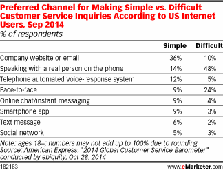 簡單的查詢方面,最受歡迎的方式是企業(yè)網(wǎng)站或電子郵件,通過電話和真人對話排在第二位。對于困難的問題,近半數(shù)網(wǎng)民希望通過電話和真人交流,面對面交談排在第二位,有四分之一受訪者選擇。