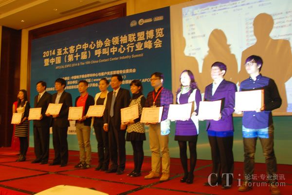 在亞太客戶中心協(xié)會領(lǐng)袖聯(lián)盟的年度頒獎典禮和晚宴上,來自馬來西亞、澳大利亞、菲律賓、新加坡、新西蘭、中國、韓國、中國香港、印度尼西亞、中國臺灣、泰國的聯(lián)絡中心優(yōu)秀代表獲得了此次亞太地區(qū)的最高行業(yè)獎項“2014中國最佳呼叫中心”。上百名國內(nèi)外行業(yè)嘉賓和媒體人士歡聚一堂,晚宴上,來自國內(nèi)外聯(lián)絡中心的表演者奉獻了一場精彩的演出,展示行業(yè)從業(yè)人員樂觀向上積極進取的風采。