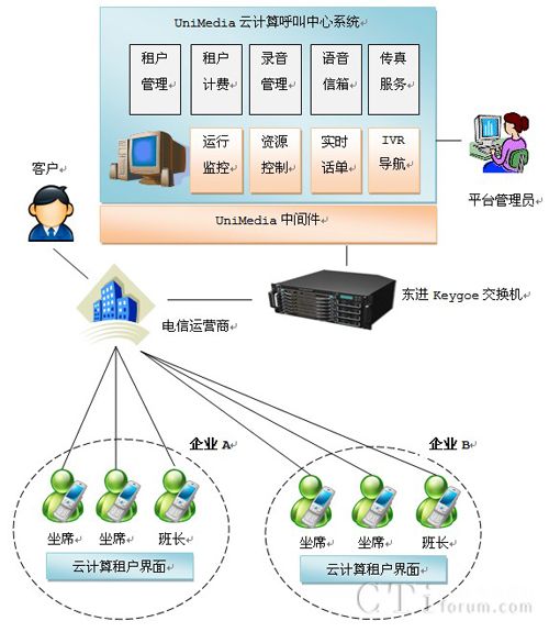 UniMedia云計(jì)算呼叫中心解決方案基于國內(nèi)領(lǐng)先的東進(jìn)Keygoo多媒體交換機(jī)和UniMedia中間件,采用中間件內(nèi)置的多租戶模式,為增值服務(wù)運(yùn)營商提供云計(jì)算呼叫中心解決方案。