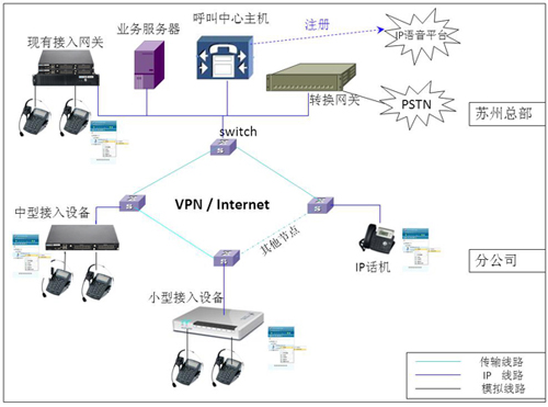 5、在其他分公司,根據(jù)坐席人員數(shù)量的不同,可以分別選用中型接入設(shè)備(幾十坐席)、小型接入設(shè)備(幾個坐席)、IP電話機(一兩個坐席)來實現(xiàn)異地坐席的接入,安裝對應(yīng)的客戶端軟件,即可和蘇州總部坐席一樣,實現(xiàn)完全一樣的呼叫中心呼入呼出功能。