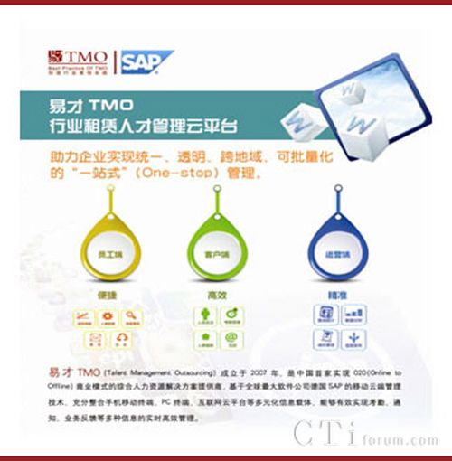 在企業(yè)運(yùn)行與管理的過程中,如何實(shí)現(xiàn)人員的分散性管理難題,如何實(shí)現(xiàn)工作信息的即時交互共享?如何有效提升工作效率、持續(xù)優(yōu)化人員產(chǎn)能,一直是國際上企業(yè)與運(yùn)營績效提升的重要研究課題。易才博普奧基于在服務(wù)外包領(lǐng)域十余年的應(yīng)用經(jīng)驗(yàn),基于全球最大軟件公司德國SAP公司的移動云端管理技術(shù),充分整合移動終端、PC終端、互聯(lián)網(wǎng)云平臺等多元化信息載體,徹底打破了傳統(tǒng)企業(yè)管理過程中時間與空間的限制,能夠有效實(shí)現(xiàn)員工端、客戶端、運(yùn)營端三大業(yè)務(wù)模塊的實(shí)時高效管理。助力企業(yè)輕松實(shí)現(xiàn)統(tǒng)一、透明、跨地域、可批量化的“一站式”(One-stop)管理,突破式提升企業(yè)運(yùn)營績效水平。易才TMO旨在以創(chuàng)新驅(qū)動發(fā)展,用技術(shù)改變未來,持續(xù)為客戶帶來更有價值的全方位管理服務(wù)以及全新的應(yīng)用體驗(yàn),攜手創(chuàng)造最佳行業(yè)實(shí)踐與應(yīng)用典范。