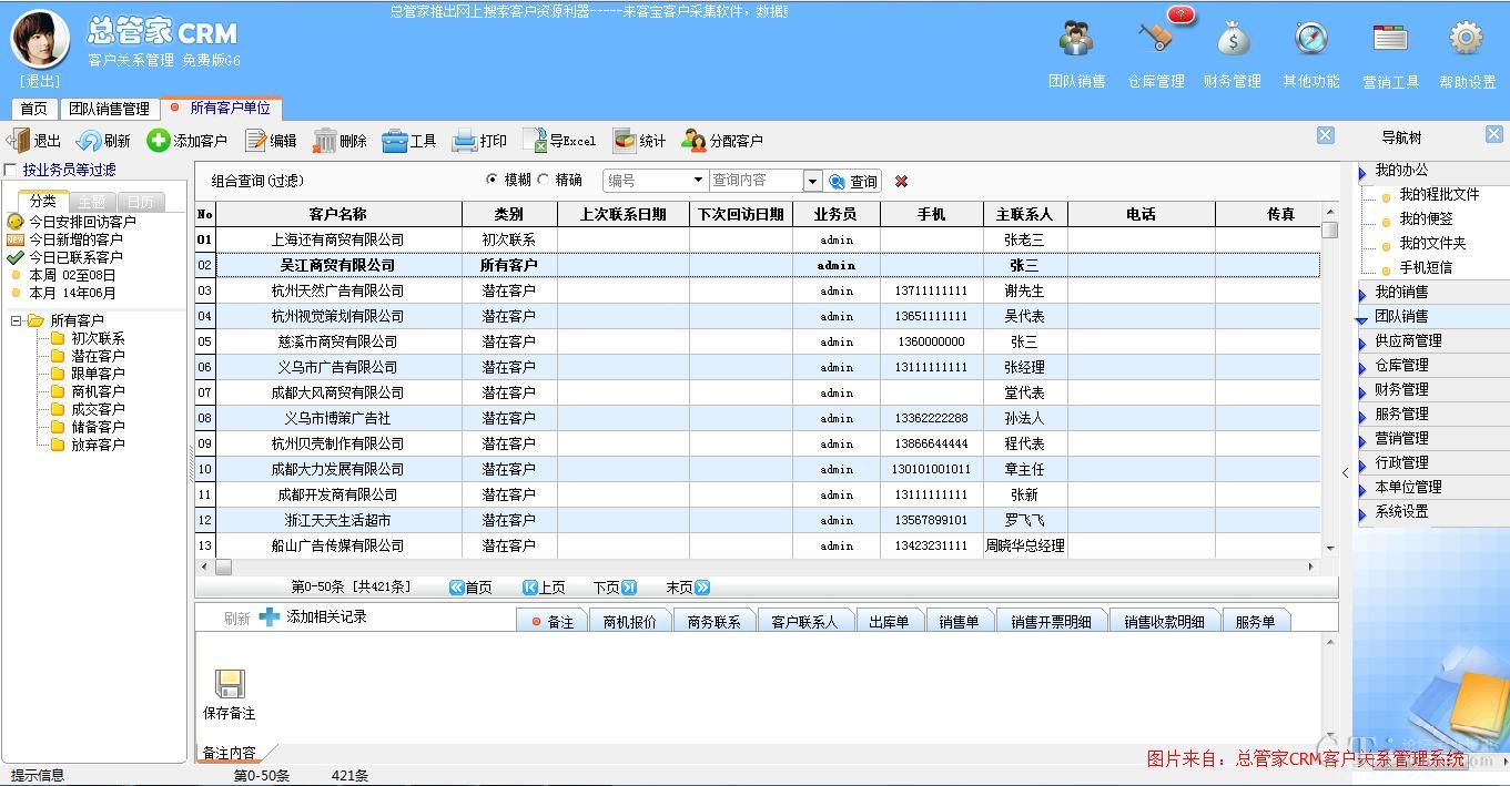 任丘永利使用總管家軟件一段時間后,客戶管理水平明顯提升,使用軟件就可以管理客戶資料,跟單聯(lián)系記錄,客戶拜訪安排,客情維護(hù),銷售訂單管理,工作提醒等功能。業(yè)務(wù)員將客戶資料錄入或者EXCEL導(dǎo)入到系統(tǒng),就能夠?qū)崟r掌控客戶跟進(jìn)的最新情況。