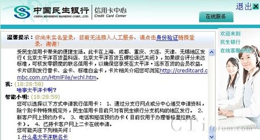 據(jù)悉:該系統(tǒng)目前已開通了Web與短信機(jī)器人兩條交互渠道。用戶登陸民生銀行信用卡中心官方網(wǎng)站,點擊右上角“在線客服”,便可通過Web頁面與由國內(nèi)智能機(jī)器人第一品牌小i機(jī)器人提供的“智能小明”進(jìn)行自然語言交流,咨詢問題,辦理業(yè)務(wù)。而在移動端,用戶則可發(fā)送短信至1069028995568辦理相關(guān)業(yè)務(wù)。