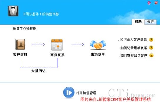 總管家CRM系統(tǒng)是成都總管家軟件有限公司研發(fā)出的一款專門針對(duì)中小企業(yè)客戶關(guān)系管理的軟件。自2003年問(wèn)世以來(lái),已有十年的歷史,十年來(lái)總管家CRM系統(tǒng)不斷改進(jìn)和升級(jí),版本從以前的1.00到現(xiàn)在的6.12,新版本擁有完善的業(yè)務(wù)流程,強(qiáng)大的自定義,操作簡(jiǎn)單、易學(xué)易用,更加符合用戶的操作習(xí)慣。
