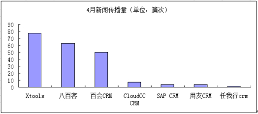 從新聞傳播量來看,本月新聞傳播量最高的是Xtools,其新聞傳播量為77篇次,八百客同樣緊隨其后以63篇次次之,百會(huì)CRM的新聞傳播量為50篇次。除此之外,CloudCC、SAP、用友、任我行的新聞傳播量均為個(gè)位數(shù)。