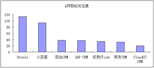在移動(dòng)關(guān)注度方面,Xtools和八百客同樣不相上下,分別以113和93的移動(dòng)關(guān)注度指數(shù)位居前兩位。而百會(huì)、SAP、任我行、用友、CloudCC在移動(dòng)戰(zhàn)略上明顯延后,其移動(dòng)關(guān)注度指數(shù)沒有明顯的差異,基本都在30左右。