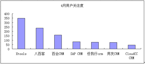 在用戶關(guān)注度方面,Xtools一直保持其領(lǐng)先優(yōu)勢(shì),以347的用戶關(guān)注度指數(shù)蟬聯(lián)最受用戶關(guān)注的CRM品牌。而八百客的用戶關(guān)注度指數(shù)為237,其推出淘寶賣家專屬CRM吸引了業(yè)界以及用戶的廣泛注意。而百會(huì)CRM的用戶關(guān)注度指數(shù)為157,相較于前兩者有明顯的差距。此外,SAP、任我行、用友、CloudCC指數(shù)普遍不高,均沒有突破100。