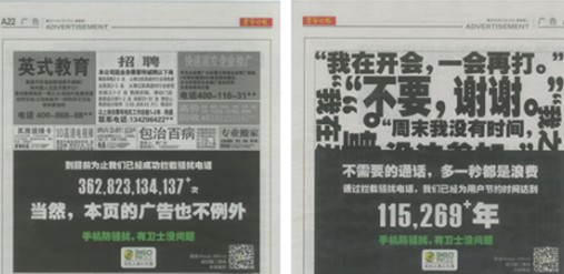 “不需要的通話,多一秒都是浪費”,最近三天,《京華時報》連續(xù)刊登整版“兇殘”廣告,直擊垃圾短信和電話騷擾。第一天,在報紙常見的分類廣告頁面,360手機衛(wèi)士攔腰打出這樣的口號:到目前為止我們已經(jīng)成功攔截騷擾電話362823134137+次,當(dāng)然,本頁的廣告也不例外;第二天,滿屏拒絕騷擾電話時的無奈,“不要,謝謝!”這些不起眼的點滴時間,加起來,竟然超過115269年。