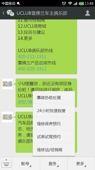 一般用戶在微信平臺(tái)上關(guān)注該賬號(hào),進(jìn)入對(duì)話界面后,通過點(diǎn)擊菜單,便可享受相關(guān)服務(wù)內(nèi)容。而積分查詢、幸運(yùn)摩天輪、UCLUB商城、維修保養(yǎng)預(yù)約四項(xiàng)特定服務(wù)內(nèi)容則針對(duì)成功綁定的雪佛蘭會(huì)員開放。